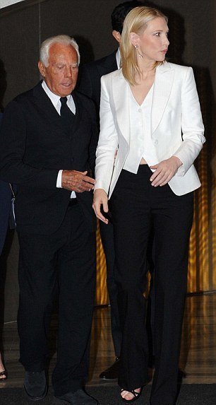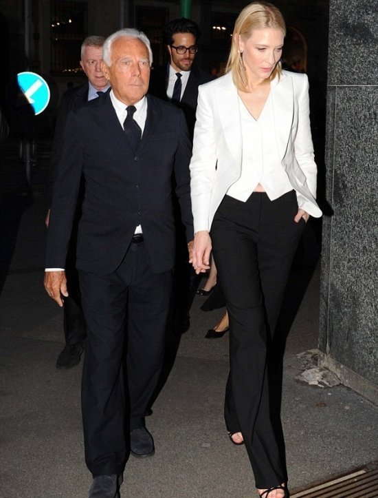 Кейт Бланшетт не тайком от мужа-) сбегала на свидание с Джорджио Армани. Дело было позавчера в Милане. Актриса, до невозможности элегантная в светлом брючном костюме (от Armani, надо полагать-) присоединилась к знаменитому модельеру за ланчем.