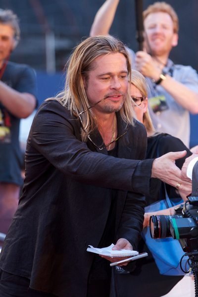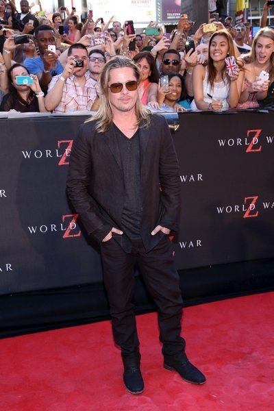 Брэд Питт не просто так раздавал интервью в Нью-Йорке — чуть позже его выступлений в защиту Анжелины Джоли в городе состоялась премьера фильма «Война миров Z», где Брэдушка сталкивается с зомби во всем мире. На сей раз Брэд исповедовал полностью коричневый цвет и распустил свои длинные волосы. Как всегда, остальные партнеры Питта по фильму были в тени нашего величества, который, к его чести, старался вести себя как можно скромнее и компанейски. Делаем ставки, в каком виде он появится в Москве через два дня. Хвостик или свободные волосы? Серый или коричныевый цвета? Или вдруг белый? Ой что-то будет! )))