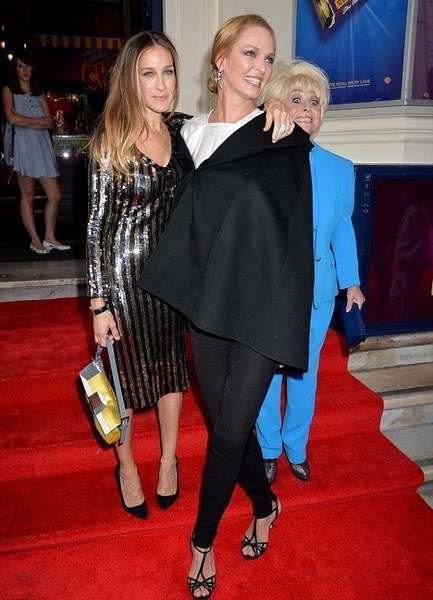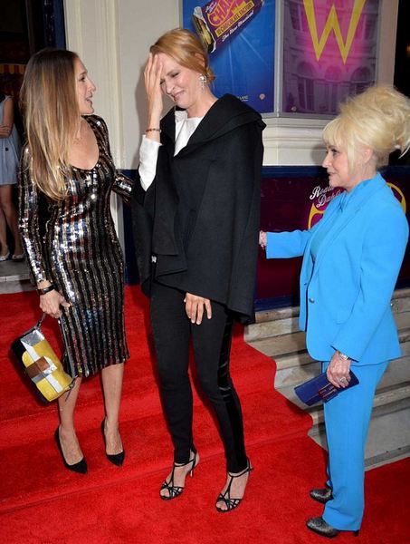 Постановка уже собрала первые положительные отзывы, а посмотреть ее помимо обычных зрителей пришли британские актеры, а также Ума Турман и Сара Джессика Паркер. Сарочка буквально блистала в золотом наряде от Marc Jacobs, Ума же выбрала черный брючный костюм и пиджак с рукавами-разрезами. Кто победил в этой модной бите, что скажете?