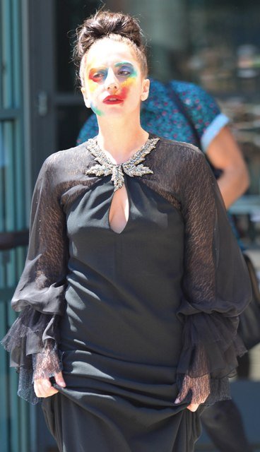 Эпатажная певица Леди Гага в очередной раз поразила почтенную публику, появившись на улице с лицом, разукрашенным во все цвета радуги. Заметим, что это все не просто так, а для дела. 19 августа выходит сингл Гаги Applause, предваряющий ее новый студийный альбом Artpop. На обложке у звезды именно такой макияж, вот она и носит его как рекламный щит-)