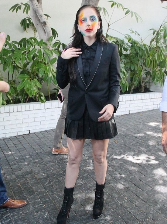Папарацци застигли Леди, когда она направляла свои стопы в студию E! на встречу с ведущим Райаном Сикрестом (тот, кстати говоря, рекламную акцию своей гостьи поддержал, и тоже вымазал лицо краской-), а затем запечатлели ее, когда она студию покидала — уже в новом наряде и прическе!-)