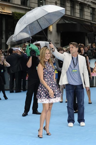 Лондон, как всегда, подкузьмил с погодой и порадовал гостей дождем, так что Джен пришлось прятаться под зонтиком. ну, а Джейсон Судейкис — мужик закаленный, ловил дождь ртом, молодчага!