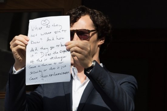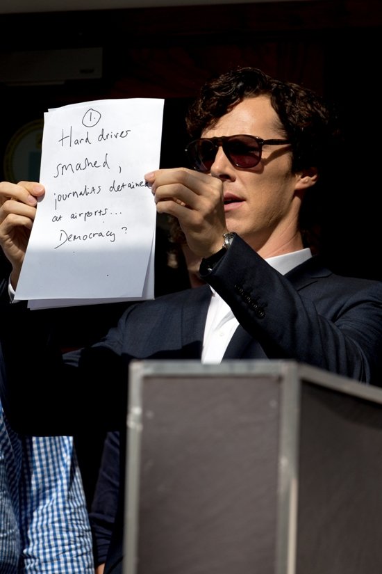 Пару дней назад он появился перед объективами с табличкой «Езжайте снимать в Египет и покажите миру что-то важное». Теперь, наоборот – звезда «Шерлока» стремится к тому, чтоб лишний раз привлечь внимание фотографов и высказать свое мнение по поводу действий британского правительства. Возмущение Камбербача вызвано недавним задержанием в аэропорту Хитроу Дэвида Миранды , партнера журналиста The GuardianГлена Гринвальда.