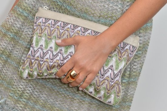 Ближе видно, что у ткани, из которой пошито платье, очень интересная фактура: мелкая сетка с ненавязчивым вкраплением люрекса. Еще видно красивую вышивку на клатче.