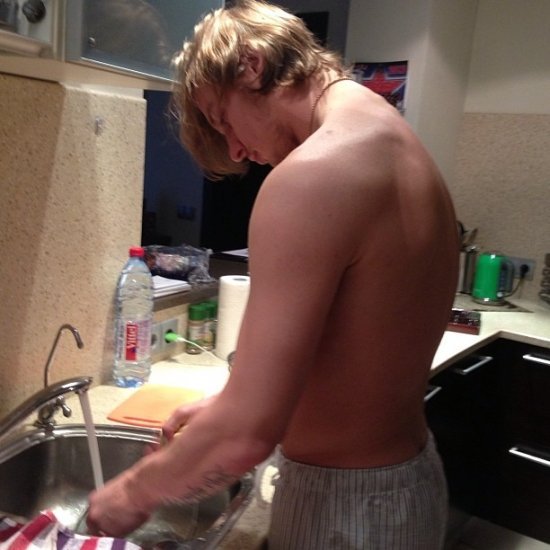Лера Кудрявцева решила сразить завистников наповал — и поделилась милым, интимным домашним фото. Вроде как, обычная бытовая сценка — полуголый муж моет посуду. Но не стоит забывать, что Лерин муж — профессиональный хоккеист с соответствующим… гм… экстерьером, и, следовательно, картинка получилась довольно таки эффектной.