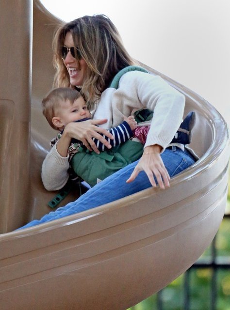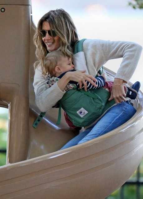 Супермодель выбралась на прогулку в один из парков Бостона вместе с сыном Бенджамином — его велосипед она толкала перед собой, и дочкой Вивьен — та сидела в переноске у мамы на животе. На пути им встретилась горка, и Жизель с Вив обе на ней прокатились, причем вместе: Жизель не стала вынимать кроху из переноски, и, таким макаром, во-первых, сэкономила время, во-вторых, лично проконтролировала процесс-) и, в-третьих, сама детство вспомнила-)