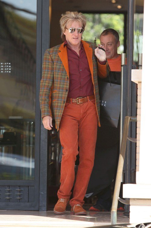 И, напоследок — просто яркий, стильный и рок-н-ролльный Род Стюарт в клетчатом пиджаке и оранжевых брюках. Образ, который наглядно демонстрирует — возраст дядечке не помеха, есть у него еще порох в пороховницах…и ягоды в ягодицах…