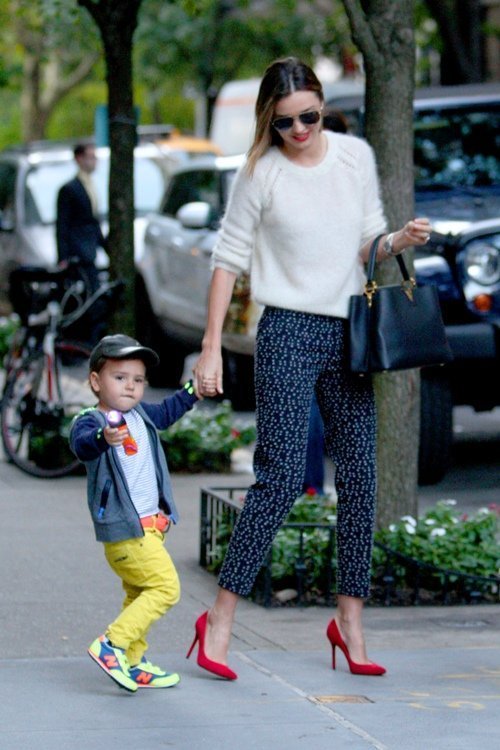 Эту парочку мы знаем и любим, что правда, то правда. Миранда Керр обычно выглядит очень элегантной и изящной — за исключением тех случаев, когда ее одолевается чрезмерная тяга к эксгибиционизму. Но, стоит признаться — в это парном образе нас скорее привлекли ярко-желтые штаны симпатяги Флинна, и только потом мы присмотрелись к милым брюкам в горошек и красных туфлях, которые выбрала для прогулки его мама.