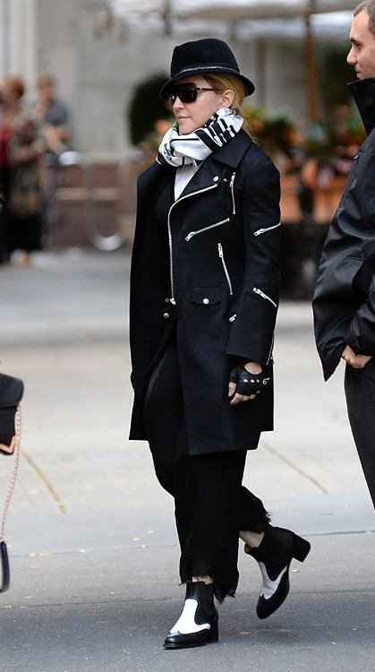 Многим этот образ покажется довольно таки сомнительным, но нам кажется, что в таком наряде Мадонна выглядит лучше, чем сплошь затянутой в черную кожу. Конечно, она в отличной форме, но, все же, возраст дает о себе знать и некоторые вещи смотрятся на великолепной Мэдж не очень уместными. Помимо обилия интересных деталей, графичный образ Мадонны еще и очень символичен, он напоминает о стиле Майкла Джексона — выходит, что королева поп-музыки оделась в умершего короля…