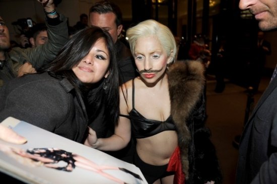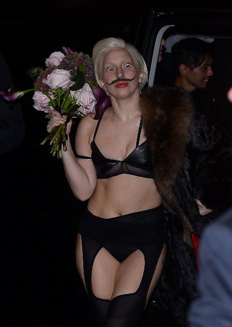 Далее вечерком Леди направила свои стопы в популярный клуб Berghain. Для этого мероприятия она надела на себя образ… видимо, Сальвадора Дали, если бы он был блондинкой, носил шубы поверх нижнего белья и каблуки-убийцы-) Да-да, вы правильно поняли: от Дали там только усы-)