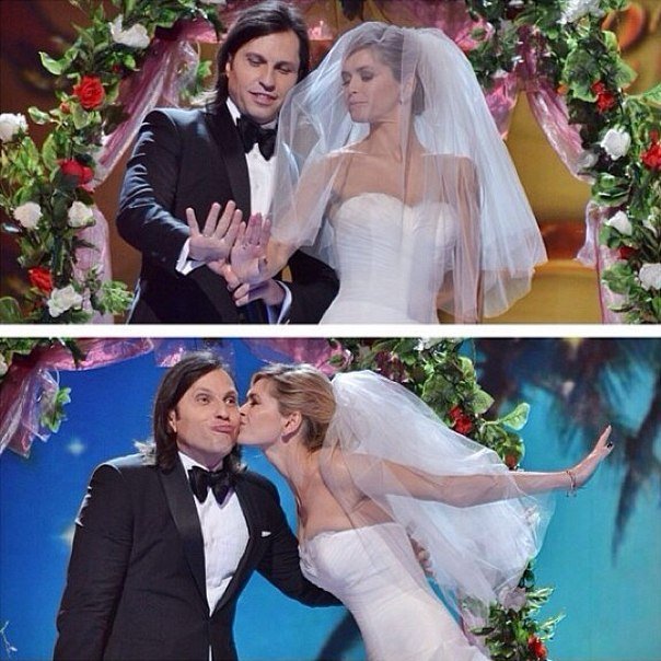 На фото неожиданная пара запечатлена вместе в свадебных нарядах, при этом они хвастаются обручальными кольцами. Конечно, учитывая то, что такой союз крайне внезапный, фанаты предполагают, что это кадры с каких-нибудь новогодних съемок или нового клипа одного из «молодоженов».