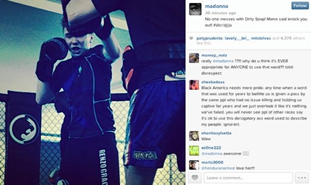 Недавно мы сообщали, что вследствие танцев на высоких каблуках певица так травмировала ногу, что врачи прописали её передвигаться на костылях. Но знаменитость-энерджайзер не смогла бы усидеть на месте и сама себе разработала систему упражнений на костылях, чтобы не пропускать тренировки. Рядом со своим фото с тренировки она поместила фото сына Рокко, который занимается боксом, и подписала снимок: «Мамочка обещает отправить тебя в нокаут, ниггер».