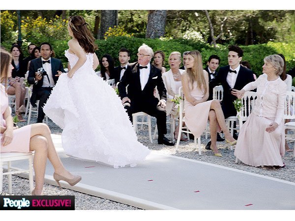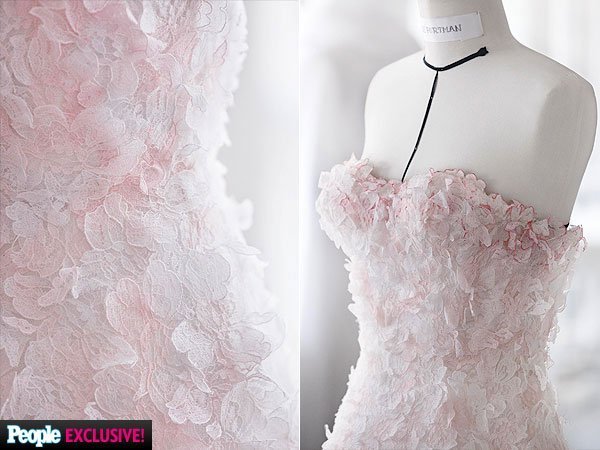Благодаря журналу People мы имеем возможность детальней рассмотреть платье невесты. Сообщается, что на его создание было потрачено более 600 часов работы. Каждый цветок был вырезан вручную, и окрашен в розовый/белый оттенок таким образом, чтобы при общем взгляде не платье создавался эффект Ombre.