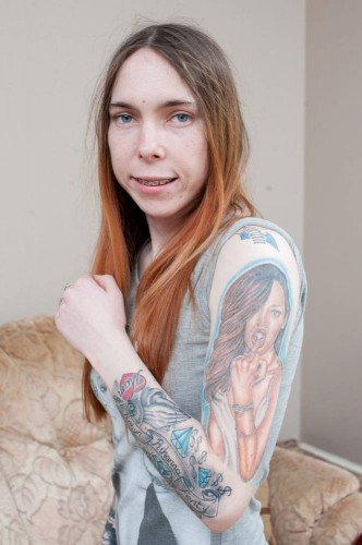 23-летняя британка просто без ума от барбадосской певицы Рианны, и чтобы её пристрастие всем бросалось в глаза, разрисовала своё тело татуировками с изображением любимой артистки.