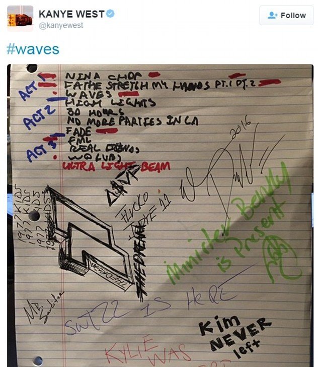 Кроме того, Канье опубликовал список песен своего нового альбома, но не в печатном варианте, а на листке из записной книжки, где оставили автографы его друзья и близкие.