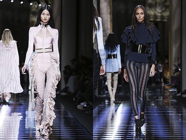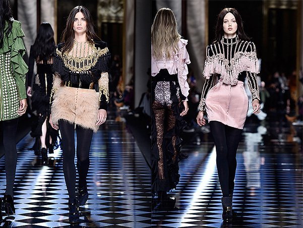 В новой коллекции есть место и тяжёлым мантиям, и шнурованным корсетам-блузкам, сапогам-чулкам и даже платьям-бюстье из кожи. Помимо выше названных моделей в нарядах от Balmain по подиуму прошлись Карли Клосс, Алессандра Амбросио, Саша Лусс, Джордан Данн, Линди Уиксон и другие.