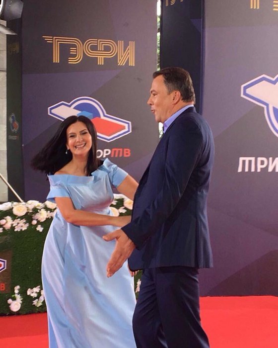 Не менее интересное платье Стриженова выбрала для премии ТЭФИ. Голубой наряд мешковатого кроя лишил любой возможности посмотреть на округлившийся животик знаменитости.