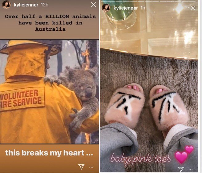 Но вскоре после публикации о трагической гибели животного мира в Австралии Кайли поделилась историей из Instagram о том, что она носит розовые норковые туфли «Louis Vuitton» в дополнение со своим розовым маникюром, также демонстрируя подписчикам свой педикюр. Несколько фанатов сняли фотографии этих историй и разместили их рядом с коалой. Пользователь IG ashleyollie269 сделал именно это, подписав пост: «СОХРАНИТЕ КОАЛ, НО УБИВАЙТЕ!». Сразу после того, как @kyliejenner опубликовала печальные истории о гибели коал в Австралии, она опубликовала счастливую историю о том, что ее пальцы ног согревают убитые норки. «Когнитивный диссонанс убивает мир».