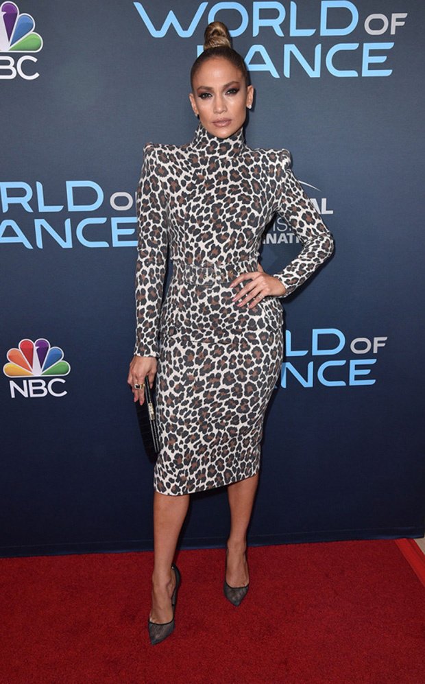 Образ Дженнифер Лопес на мероприятие «World Of Dance FYC» в мае 2018 года был, по меньшей мере, затмевающим само мероприятие! 50-летняя звезда, сыгравшая в фильме «Стриптизерши», приняли участие в мероприятии и выглядела идеально в нестареющем образе в виде плотно облегающего платья с длинными рукавами с высоким горлом и гепардовым принтом по всей ткани. Ее волосы были зачесаны назад и закручены в булочку, и ее сексуальное платье сочеталось с классическими черными туфлями! Без сомнения, Джей Ло выглядела сияющей в этом сказочном платье!