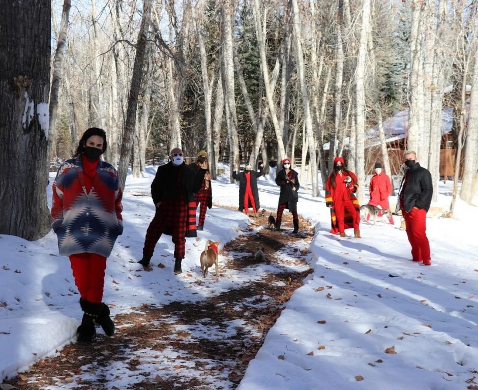 В социально-дистанцированном образе 58-летняя актриса стояла в снегу в окружении близких, в том числе трёх своих дочерей. Помимо масок, все участники группы были одеты в пижамы соответствующего цвета.