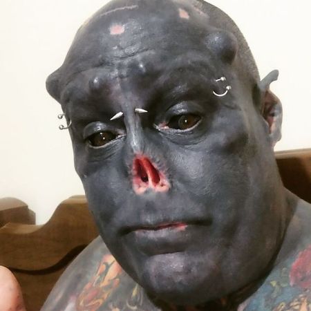 Если вы решили, что на этом мужчина остановился, то вы сильно ошибаетесь. Несколько пластических операций показались недостаточным видоизменением своего тела. Фернандо принял решение сделать импланты на голове, которые служат ему в качестве рогов. Дантисты же помогли фанату сделать из его зубов настоящие клыки, покрытые золотыми коронками. Также мужчина самостоятельно зататуировал свои глазные яблоки черным пигментом.