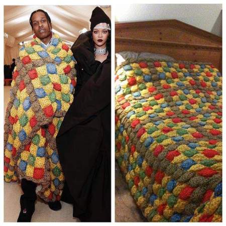 Всемирно известный рэп-исполнитель A$AP Rocky в этом году появился на Met Gala фестивале в очень необычном образе: мужчина укутался в разноцветное одеяло.