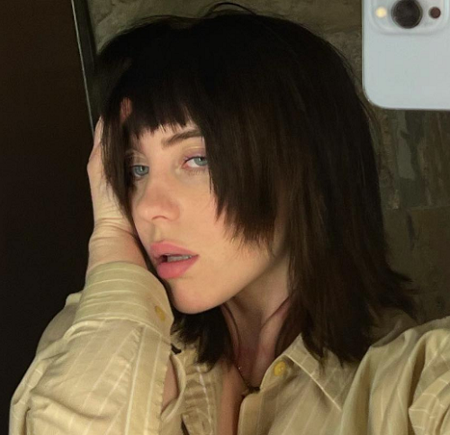20-летняя Билли Айлиш всегда меняет с легкостью прическу, и это именно то, что она сделала в своем последнем посте. Певица дебютировала в новом угольно-черном оттенке волос с очень короткой челкой спереди и более длинными частями по бокам.