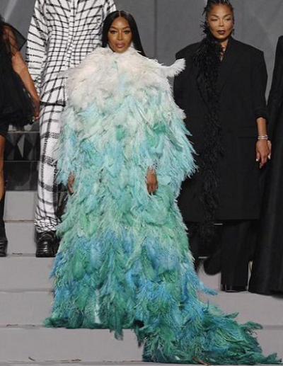 Последние несколько недель Наоми много путешествовала. Буквально на днях она была в Катаре, когда посетила выставку Forever – Valentino, в огромном ярко-розовом головном уборе с перьями, закрывающем лицо и сочетающемся с розовым платьем.