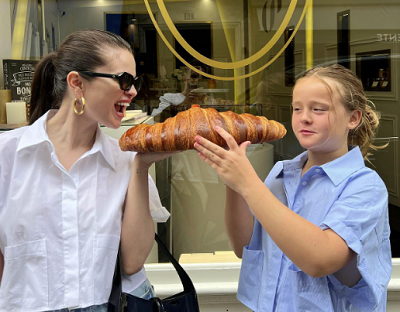 Селена Гомес и ее младшая сестра Грейси, одетые в одинаковые рубашки в Париже, лакомились огромным круассаном.