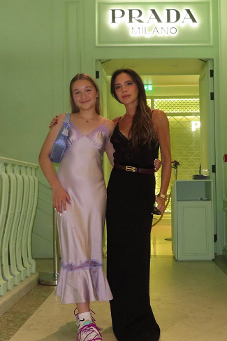 На первом фото гордая мама стоит, обняв Харпер, перед неоновой вывеской Prada, которая ярко сияет на мятно-зеленом интерьере кафе. Улыбающиеся мама и дочь были одеты в стильные платья по этому случаю: Харпер в элегантном фиолетовом платье-комбинации, а Виктория выбрала черное платье в пол на бретельках.